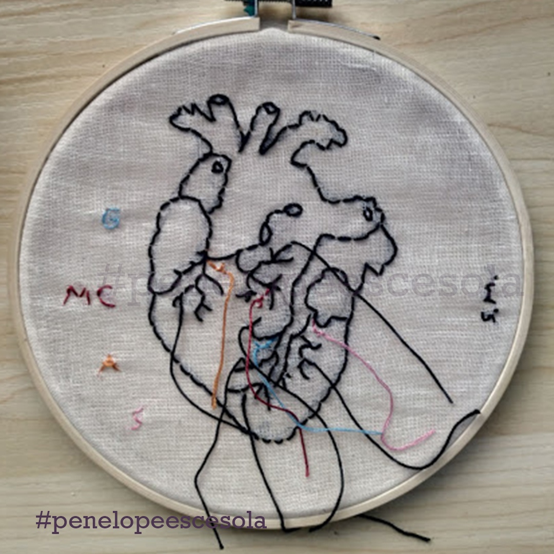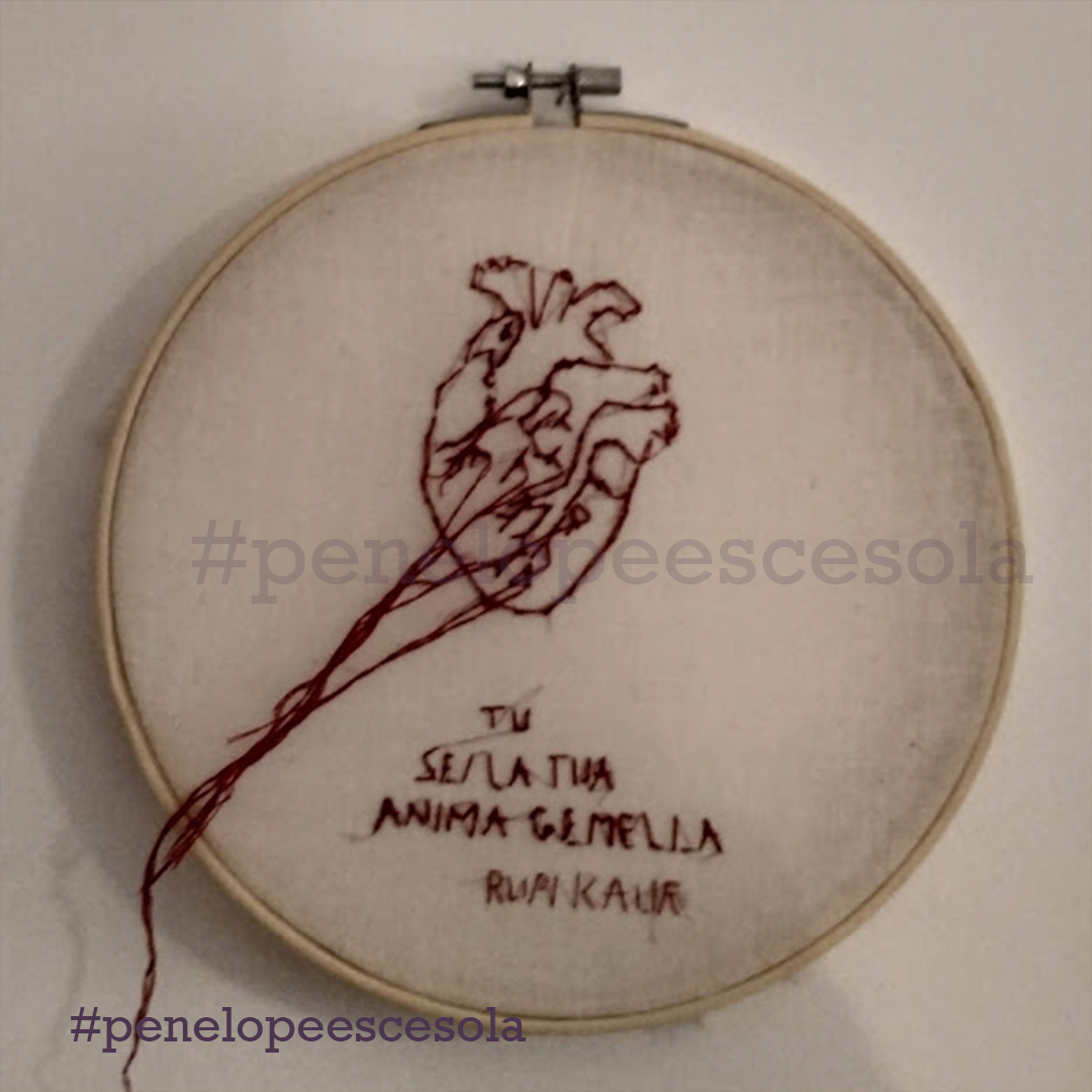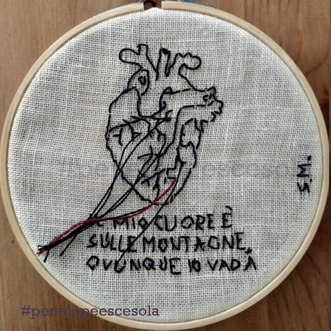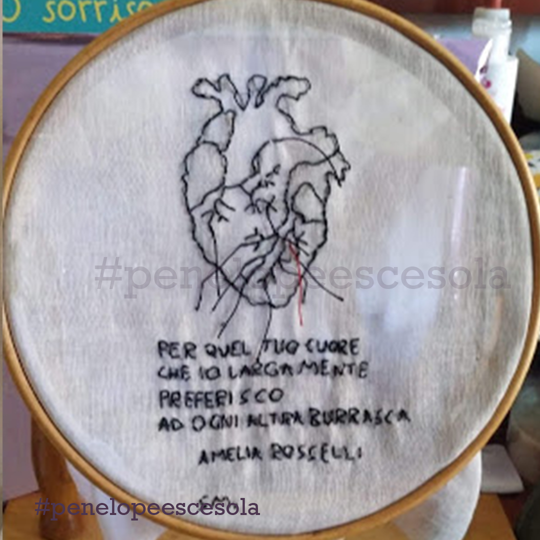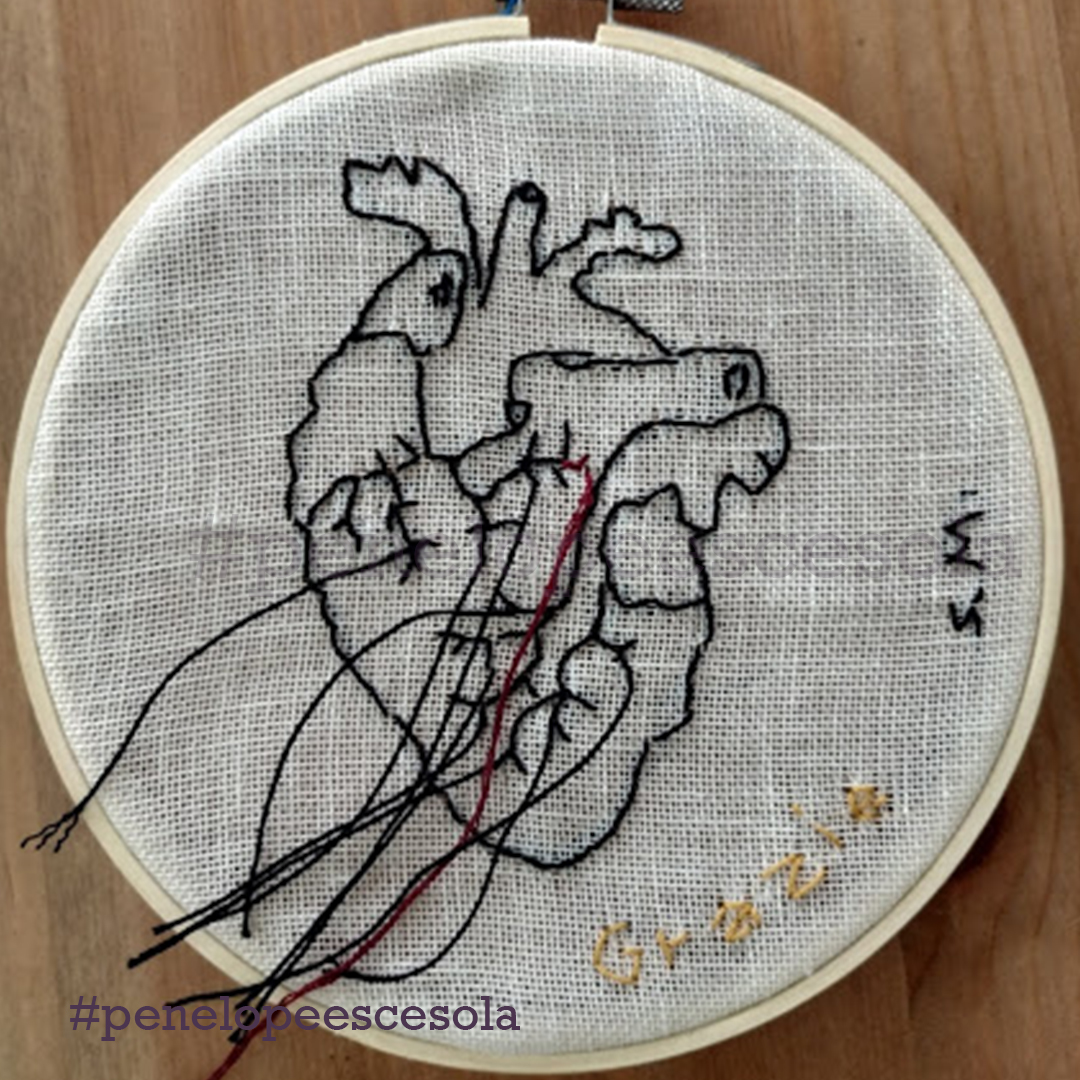 Chiusa in casa, ho iniziato a ricamare alcuni versi della poesia di Mariangela Gualtieri “Nove marzo 2020”. Così ho scoperto una forma di espressione artistica che mi appartiene. Mia madre mi ha dato il telaio e dei fili con cui aveva realizzato dei lavori quando era giovane. Ho ricamato cuori: ad ogni punto, un sospiro e un pensiero dedicato alla persona che avrebbe ricevuto in dono quel mio artefatto. Ora sto proseguendo, sperimentando anche nuovi tessuti, comprese le t-shirt.